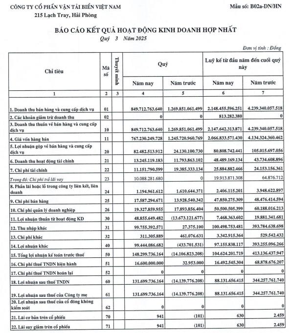 CTCP Vận tải Biển Việt Nam (Vosco, mã ck: VOS) vừa công bố báo cáo tài chính hợp nhất quý III/2025 với kết quả tích cực.