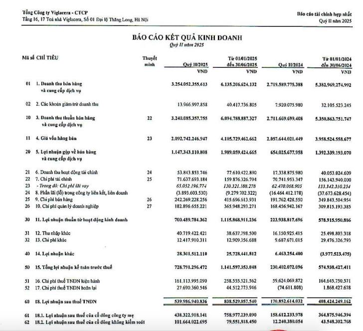 Tổng Công ty Viglacera - CTCP (mã ck: VGC) vừa công bố báo cáo tài chính hợp nhất quý II/2025 với doanh thu thuần hơn 3.240 tỷ đồng, tăng 19% so với cùng kỳ.