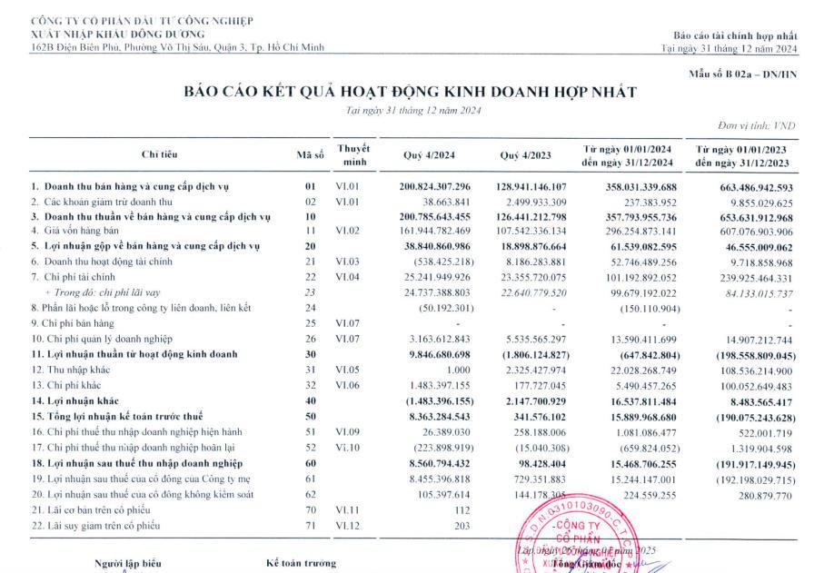 Công ty cổ phần Đầu tư Công nghiệp - Xuất nhập khẩu Đông Dương (mã ck: DDG) vừa thông báo kết quả hoạt động kinh doanh hợp nhất quý IV/2024.