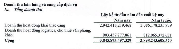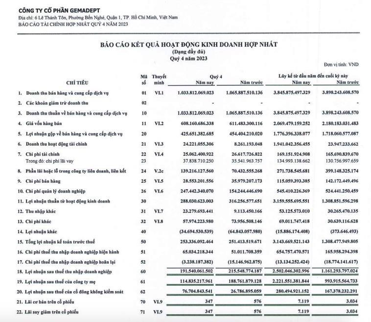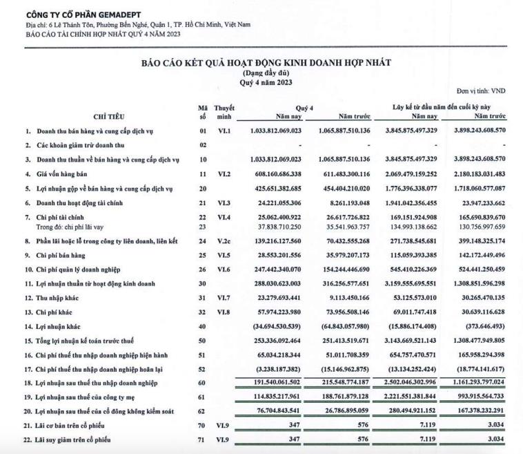 Theo đó, trong 3 tháng cuối năm 2023, doanh thu thuần của Gemadept giảm 3% về 1.034 tỷ đồng.