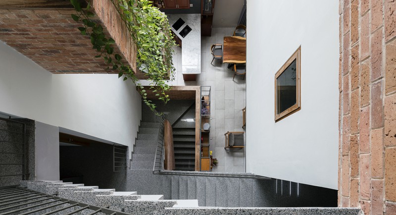 Cầu thang được tùy chỉnh đặc biệt và thay đổi từ tầng này sang tầng khác, để tránh sự lặp lại trong việc di chuyển và tối đa hóa việc sử dụng.