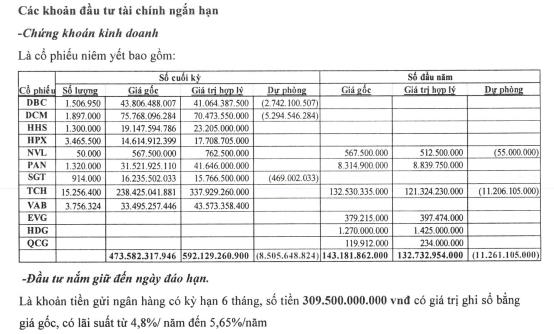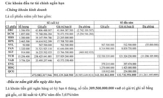 Khoản đầu tư tài chính ngắn hạn đạt 774,5 tỷ đồng, giảm 17%. Trong đó chứng khoán kinh doanh gần 474 tỷ đồng, gấp 3,3 lần đầu năm, chiếm 24% tổng tài sản.