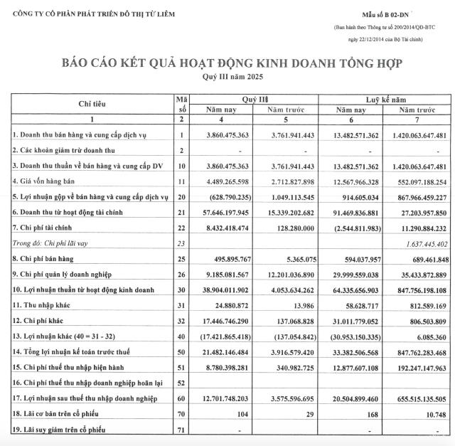 CTCP Phát triển Đô thị Từ Liêm (Lideco, mã ck: NTL) vừa công bố kết quả kinh doanh quý III/2025 và 9 tháng đầu năm.
