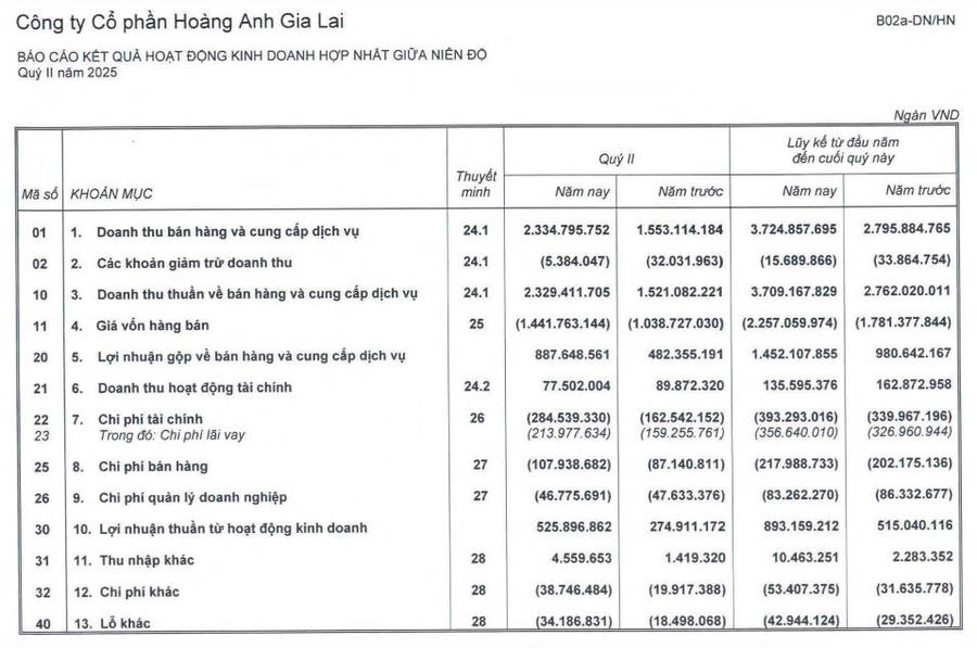 Theo báo cáo tài chính hợp nhất quý II/2025 mới công bố của CTCP Hoàng Anh Gia Lai (HAGL, mã ck: HAG), công ty ghi nhận doanh thu thuần đạt 2.329 tỷ đồng, tăng 50% so với cùng kỳ năm trước.
