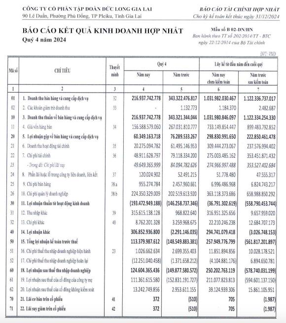 Công ty cổ phần Tập đoàn Đức Long Gia Lai (mã ck: DLG) vừa công bố báo cáo tài chính hợp nhất quý IV/2024.
