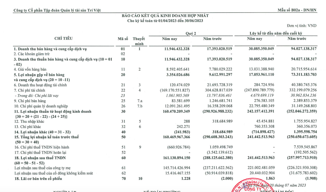 Theo báo cáo tài chính hợp nhất quý II/2023, Công ty cổ phần Tập đoàn quản lý Tài sản Trí Việt (mã ck: TVC) ghi nhận doanh thu thuần đạt 11,9 tỷ đồng, giảm 31% so với cùng kỳ năm ngoái. Nguyên nhân do doanh thu hoạt động môi giới chứng khoán và hoạt động cho vay margin giảm sâu.