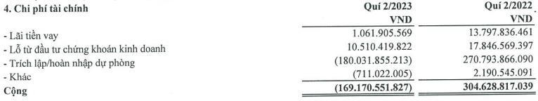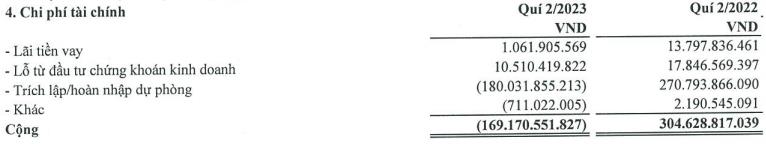Lãi từ các khoản đầu tư chứng khoán âm nặng nên doanh thu hoạt động tài chính cũng giảm 99,4%, lùi về mức 120,4 triệu đồng, trong khi cùng kỳ năm 2022 đạt 21,6 tỷ đồng.