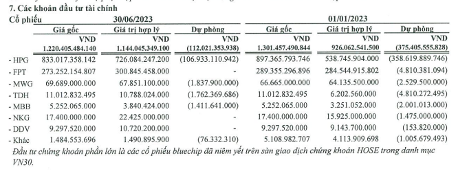 Trong danh mục đầu tư chứng khoán của TVC, đáng chú ý nhất là khoản đầu tư giá trị gốc 833 tỷ đồng vào mã HPG nhưng giá trị hợp lý cuối quý II/2023 chỉ là 726 tỷ đồng.