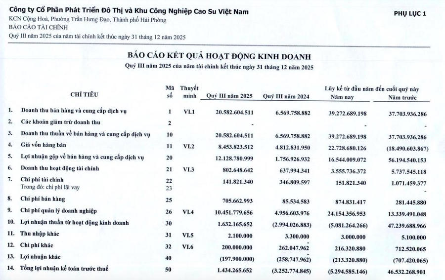 CTCP Phát triển Đô thị và Khu công nghiệp Cao su Việt Nam (mã ck: VRG) vừa công bố kết quả kinh doanh quý III/2025 với những con số tích cực.