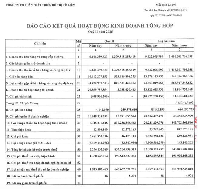 CTCP Phát triển Đô thị Từ Liêm (Lideco, mã ck: NTL) vừa công bố báo cáo tài chính quý II/2025 với kết quả ảm đạm, cùng sự 'lệch pha' giữa kết quả lợi nhuận và hoạt động kinh doanh cốt lõi.