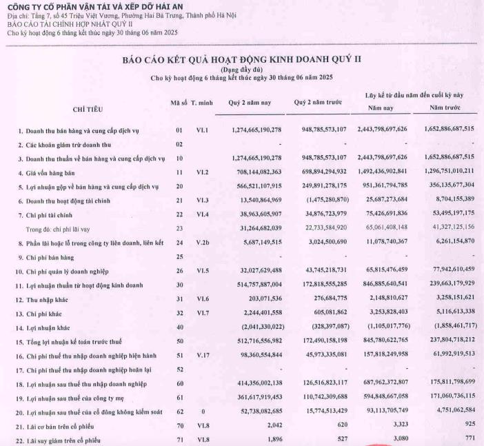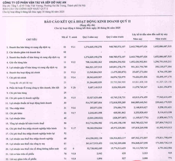 CTCP Vận tải và Xếp dỡ Hải An (mã ck: HAH) vừa công bố báo cáo tài chính hợp nhất quý II/2025 với doanh thu thuần đạt hơn 1.274 tỷ đồng, tăng 34% so với cùng kỳ năm trước.