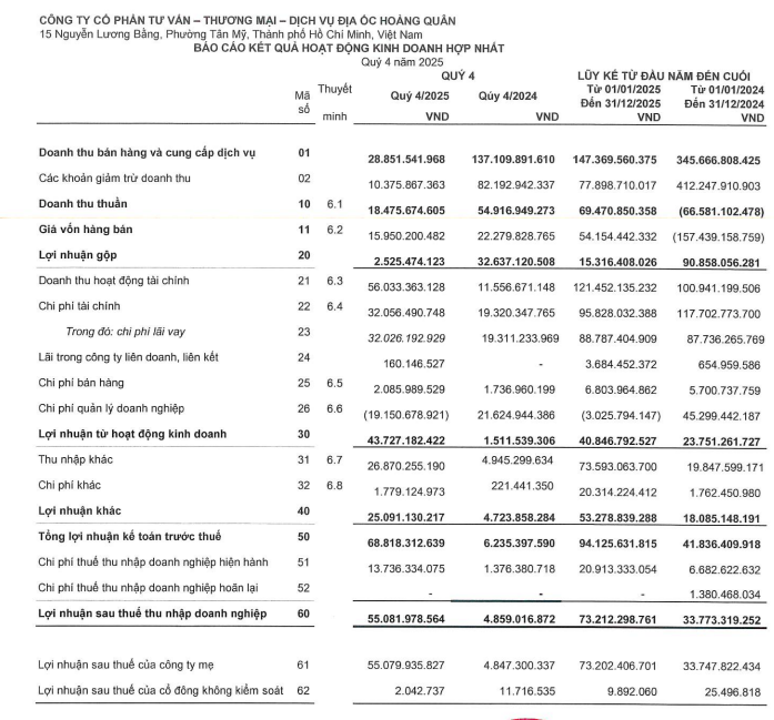 Lũy kế cả năm 2025, Địa ốc Hoàng Quân ghi nhận doanh thu đạt 69,4 tỷ đồng trong khi cùng kỳ âm 66,5 tỷ đồng; lợi nhuận sau thuế đạt 73,21 tỷ đồng, tăng 116,8% so với cùng kỳ năm trước.