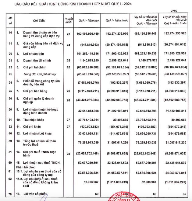 Theo báo cáo tài chính hợp nhất quý I/2024, Công ty cổ phần Phát triển Bất động sản Phát Đạt ghi nhận doanh thu thuần trong kỳ đạt 162,1 tỷ đồng, giảm 16% so với cùng kỳ năm ngoái nhưng lợi nhuận sau thuế đạt 52,6 tỷ đồng, gấp 2,2 lần về lợi nhuận so với quý I năm ngoái.