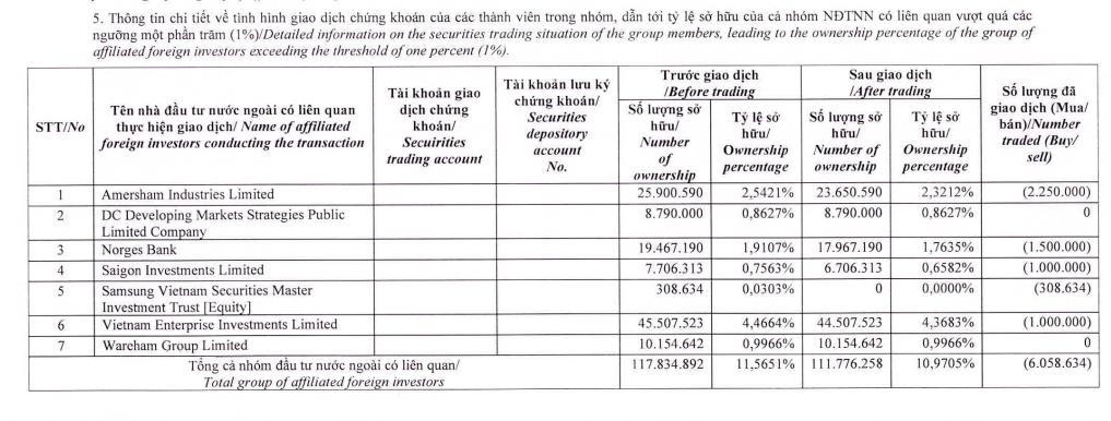 Cụ thể, Amersham Industries Limited bán ra 2,25 triệu cổ phiếu; Norges Bank bán ra 1,5 triệu cổ phiếu, Saigon Investments Limited và Vietnam Enterprise Investments Limited mỗi quỹ bán ra 1 triệu cổ phiếu và Samsung Vietnam Securities Master Investment Trust [Equity] bán ra 308.634 cổ phiếu DXG.