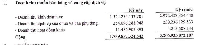 Tính chung nửa đầu năm, doanh thu thuần của công ty giảm 44% về 1.789,8 tỷ đồng, trong đó chủ yếu là doanh thu từ kinh doanh xe là 1.524 tỷ đồng (giảm 49%), còn lại là dịch vụ sửa chữa và bán phụ tùng với 254 tỷ đồng (tăng 10%).