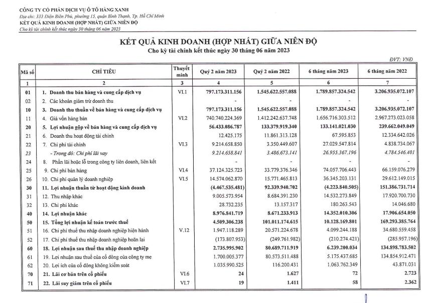 Báo cáo tài chính hợp nhất quý II/2023 của Công ty cổ phần Dịch vụ Ô tô Hàng Xanh (Haxaco, mã ck: HAX) ghi nhận doanh thu thuần đạt 797 tỷ đồng, giảm 48% so với cùng kỳ năm ngoái.