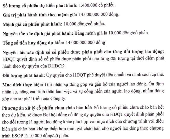 Với số lượng cổ phiếu chưa chào bán hết theo dự kiến, sẽ được Đại hội đồng cổ đông ủy quyền cho Hội đồng quản trị quyết định phân phối cho đối tượng là người lao đọng khác phù hợp với mục đích của chương trình với điều kiện giá bán không thấp hơn mức giá chào bán cho người lao động theo chương trình ESOP là 10.000 đồng/đơn vị.