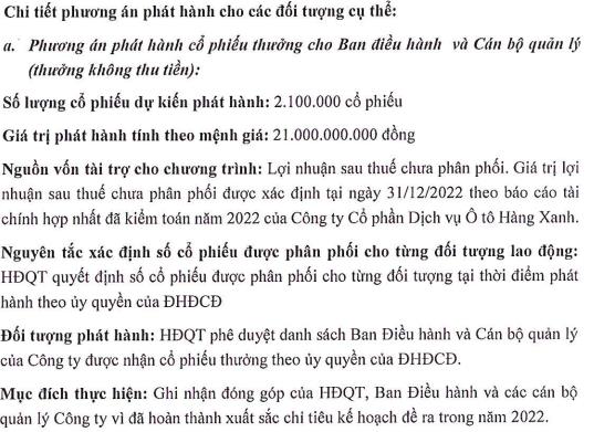 Trong 3,5 triệu cổ phiếu ESOP trên, HAX dự kiến phát hành 2,1 triệu cổ phiếu cho ban điều hành và cán bộ quản lý. Giá trị phát hành tính theo mệnh giá là dự là 21 tỷ đồng.