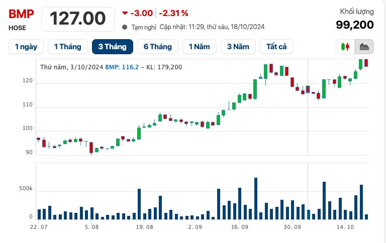 Trên thị trường chứng khoán, cổ phiếu BMP của Nhựa Bình Minh ghi nhận đà phục hồi đáng chú ý trong thời gian gần đây. Hiện tại, mã cổ phiếu này đang được giao dịch quanh mức 127.000 đồng, tăng 12% so với đầu tháng 10/2024.