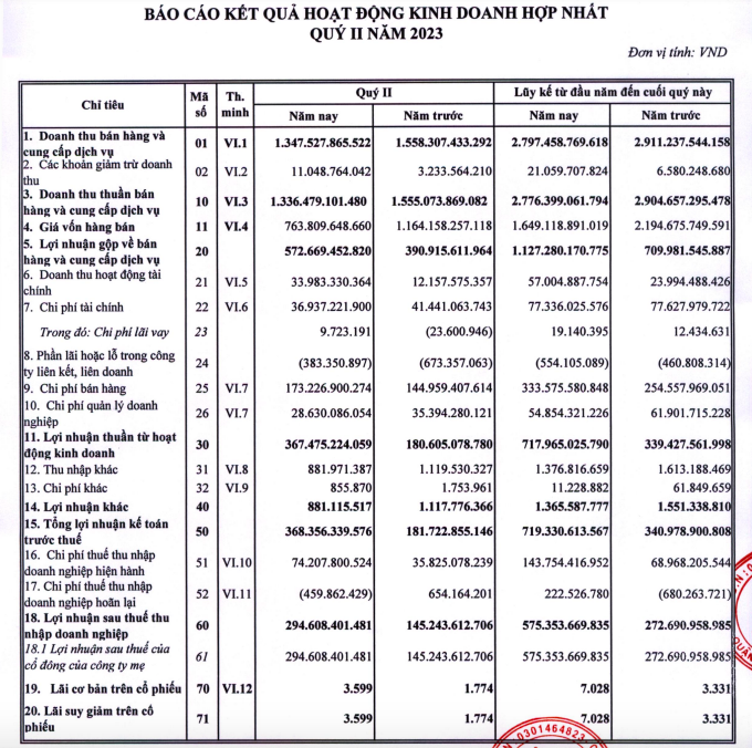 Trong kỳ, giá vốn giảm mạnh hơn mức giảm của doanh thu thuần giúp lợi nhuận gộp tăng 46%, lên mức 572,6 tỷ đồng.