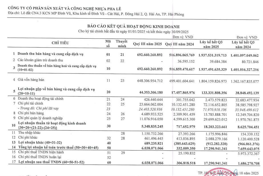 Về bức tranh tài chính, theo báo cáo kinh doanh quý III/2025, PLP ghi nhận doanh thu thuần đạt 692 tỷ đồng, tăng 34% so với cùng kỳ; lợi nhuận sau thuế đạt hơn 6 tỷ đồng, gấp 19 lần cùng kỳ năm trước.