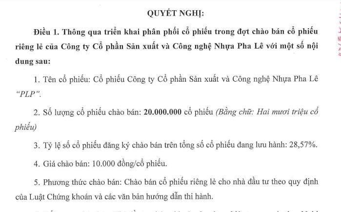 CTCP Sản xuất và Công nghệ Nhựa Pha Lê (mã ck: PLP) vừa công bố quyết nghị thông qua triển khai phân phối cổ phiếu trong đợt chào bán cổ phiếu riêng lẻ của công ty.