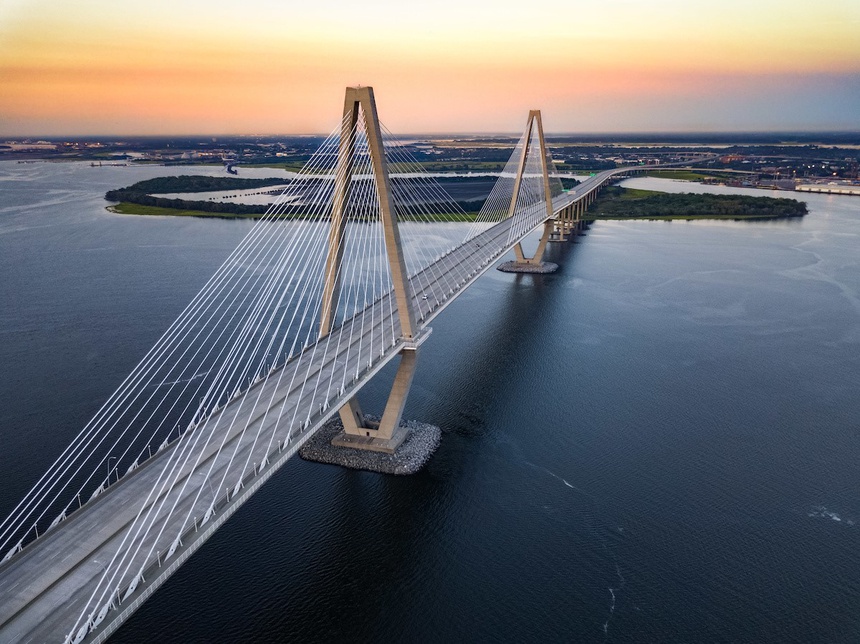 Cầu Arthur Ravenel Jr., Mỹ: Mặc dù không nổi tiếng bằng Cổng Vàng, cầu Arthur Ravenel cũng là một công trình đầy ngoạn mục. Đặc biệt, vào ban đêm, cây cầu trông càng đẹp hơn khi được thắp sáng. Arthur Ravenel có nhịp chính 471 m dài thứ ba trong số các cây cầu dây văng ở Tây Bán cầu. Bắc qua sông Cooper ở Nam Carolina. 902 triệu USD là chi phí để xây dựng cây cầu này.