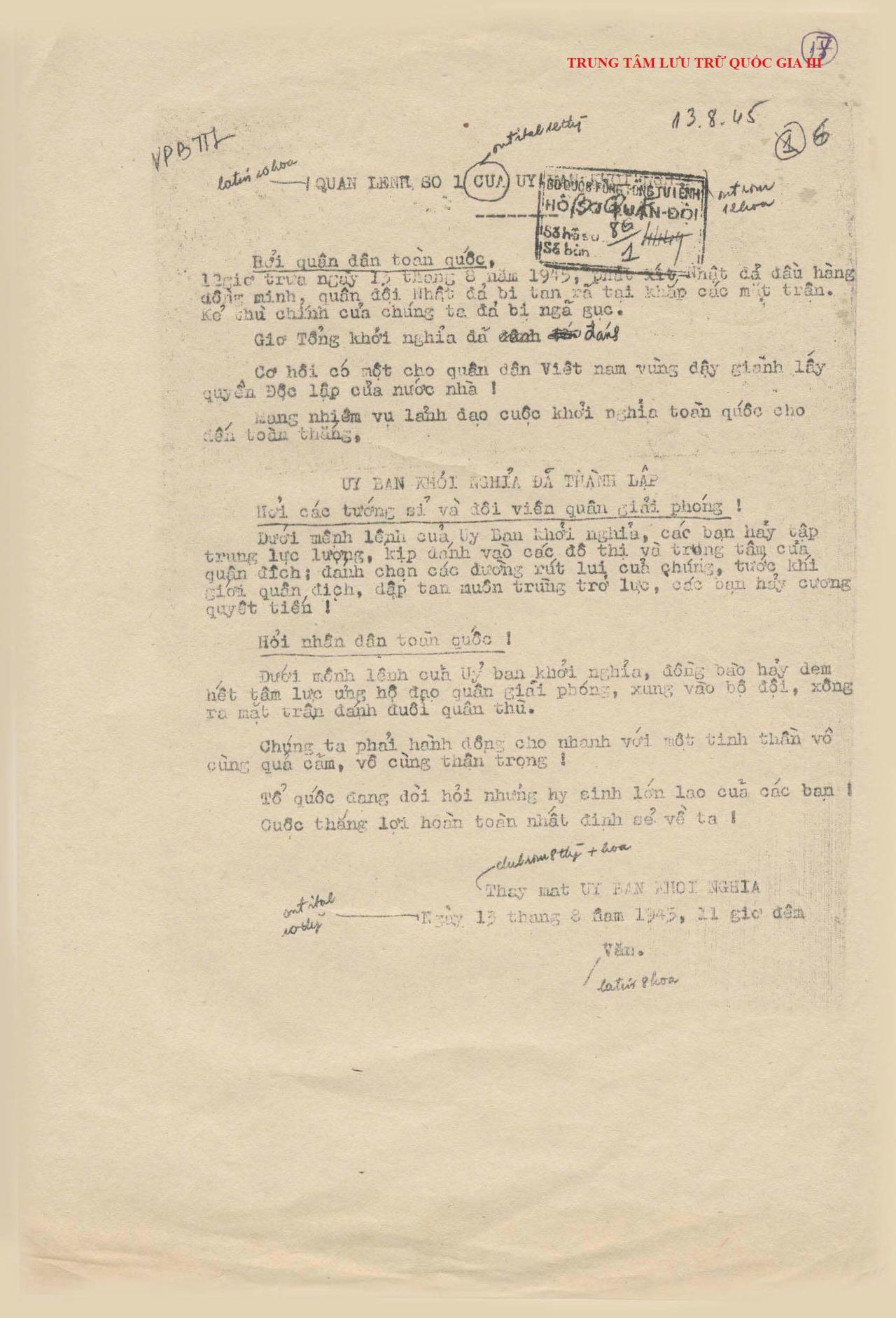 Tin phát xít Nhật đầu hàng làm điều kiện khách quan chín muồi. Lập tức, 23 giờ ngày 13/8/1945, Ủy ban khởi nghĩa toàn quốc phát đi Quân lệnh số 1, mở lệnh tổng khởi nghĩa với lời hiệu triệu: “Giờ Tổng khởi nghĩa đã đánh. Cơ hội có một cho quân dân Việt Nam vùng dậy giành lấy quyền độc lập của nước nhà!”. Tiếp theo Quân lệnh số 1, lãnh tụ Nguyễn Ái Quốc có Thư kêu gọi Tổng khởi nghĩa: “Giờ quyết định cho vận mệnh dân tộc ta đã đến. Toàn quốc đồng bào hãy đứng dậy đem sức ta mà tự giải phóng cho ta”.