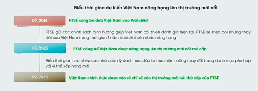 Khả năng Việt Nam sẽ được FTSE nâng hạng lên thị trường mới nổi thứ cấp sớm nhất vào kỳ đánh giá tháng 3/2025 và chính thức lọt rổ chỉ số các thị trường mới nổi thứ cấp của FTSE vào kỳ đánh giá tháng 9/2025.