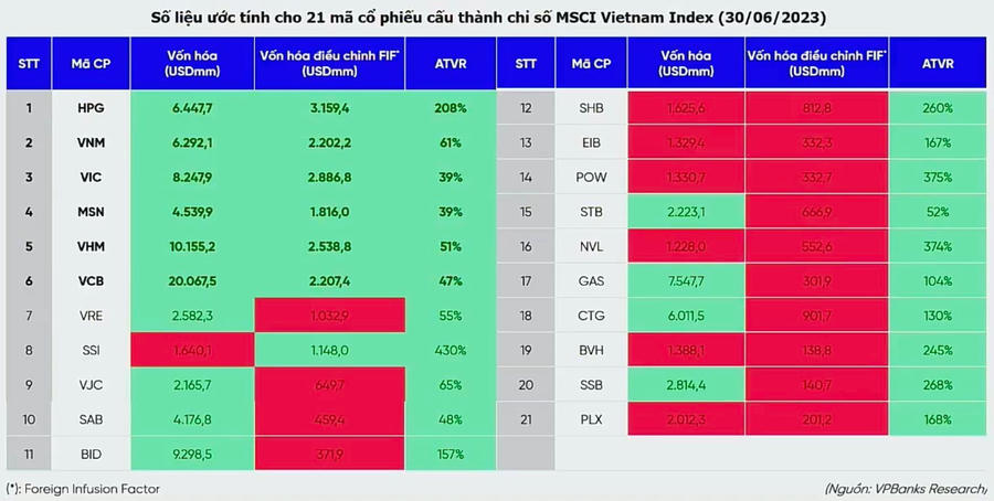 Trong trường hợp MSCI nâng hạng Việt Nam lên thị trường mới nổi, dự kiến có 6 cổ phiếu được hưởng lợi mạnh mẽ như HPG, VNM, VIC, MSN, VHM, VCB khi đạt yêu cầu về vốn hoá, vốn hoá tự do lưu hành và thanh khoản của thị trường mới nổi.