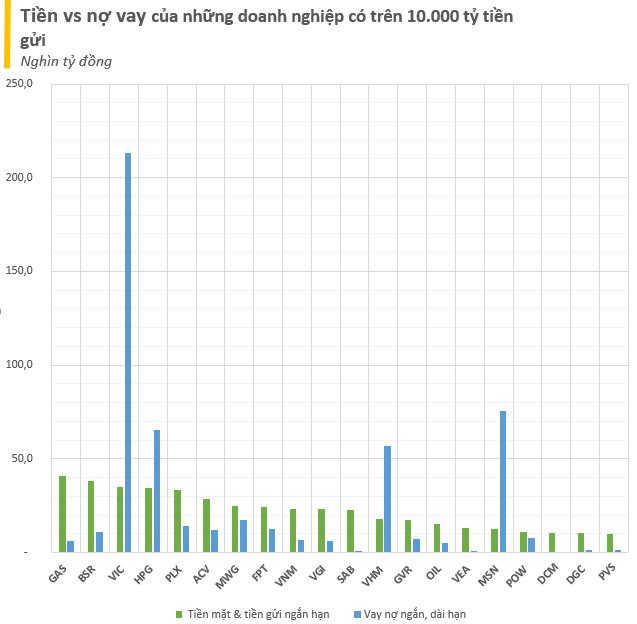 Ở phía bên kia của bảng cân đối, các doanh nghiệp "nhiều tiền" cũng đang có những khoản vay nợ. VEAM, Sabeco là những doanh nghiệp "nhẹ nợ" nhất với dư nợ chỉ từ vài trăm tỷ đồng.