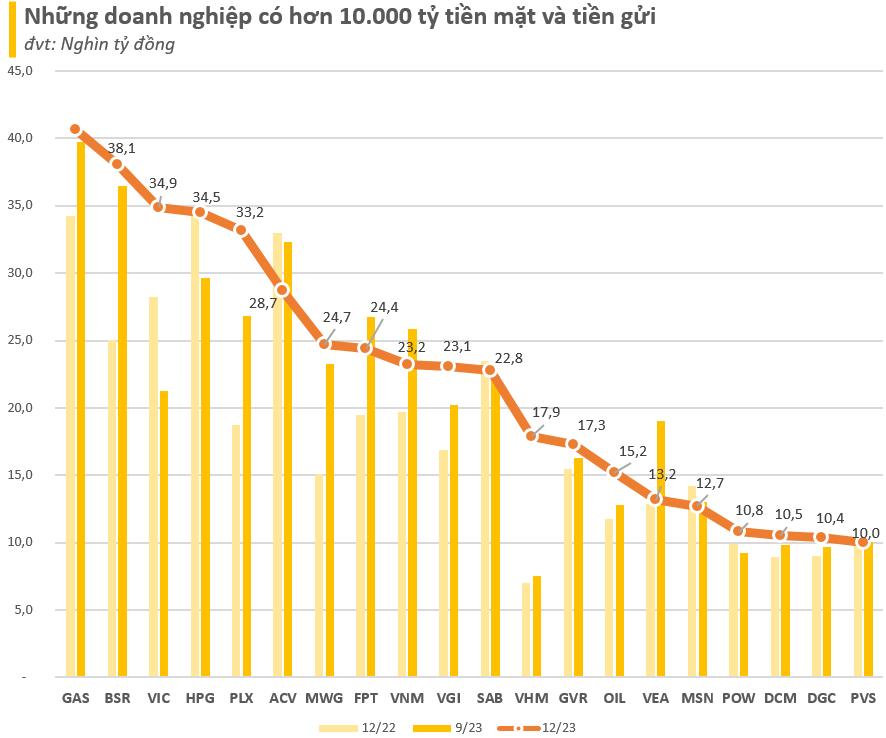 Theo thống kê của chúng tôi, tại thời điểm ngày 31/12/2023 có tổng cộng 20 doanh nghiệp trên sàn chứng khoán (không bao gồm nhóm tài chính, ngân hàng, bảo hiểm) đang nắm giữ lượng tiền (bao gồm tiền, tương đương tiền và tiền gửi) vượt ngưỡng 10.000 tỷ đồng.