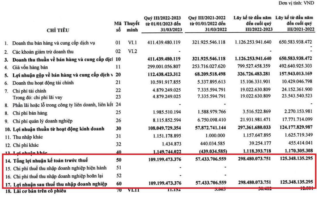 Một trong những lợi thế giúp SLS đạt được kết quả này đến từ việc được miễn thuế thu nhập doanh nghiệp do hoạt động trên địa bàn có điều kiện kinh tế - xã hội đặc biệt khó khăn. Công ty không ghi nhận khoản chi phí thuế TNDN trong 9 tháng của niên độ tài chính hiện tại. Do đó, khoản LNTT bằng nguyên phần lãi ròng thu về.