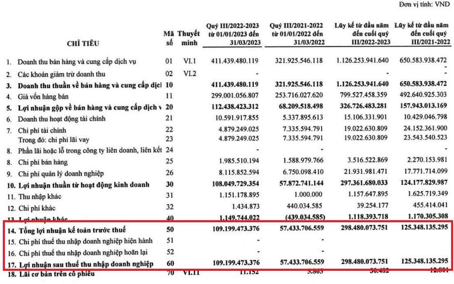Nhìn lại năm 2022 trước đó, APFCO ghi nhận lợi nhuận trước thuế cao đột biến gần 406 tỷ đồng. Nếu áp mức thuế suất phổ biến là 20% thì khoản chi phí thuế TNDN của APF sẽ khoảng 81 tỷ đồng. Tuy nhiên thực tế nhờ cơ chế đặc biệt, công ty chỉ phải chi chưa tới 1 tỷ đồng nộp thuế TNDN trong cả năm 2022.