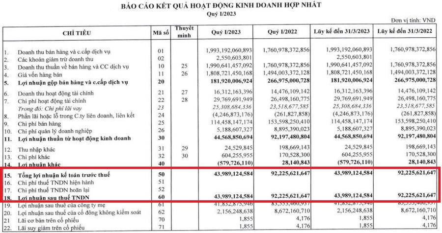Có thể thấy rõ mức ưu đãi khi nhìn vào kết quả kinh doanh quý 1/2023 vừa được APF công bố. Doanh thu quý 1 đạt 1.991 tỷ đồng, tăng trưởng 13% so với cùng kỳ. LNTT ghi nhận gần 44 tỷ đồng, bằng phân nửa so với cùng kỳ. Đáng nói, APF không ghi nhận khoản chi phí thuế TNDN hiện hành, giúp LNST bằng đúng LNTT.
