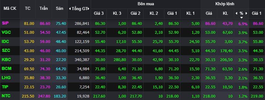 Thị trường chứng khoán phiên giữa tuần 19/2 ghi nhận đà tăng khởi sắc từ nhóm cổ phiếu bất động sản KCN. Mã SIP của Đầu tư Sài Gòn VRG bất ngờ kịch trần, đạt 86.600 đồng/cp – mức cao kỷ lục của cổ phiếu này. Trong khi những tên tuổi khác như VGC của Viglacera tăng 3,9% lên 53.000 đồng/cp, KBC tăng 3,3% lên 30.150 đồng/cp, BCM tăng 2,6% lên 71.300 đồng/cp.