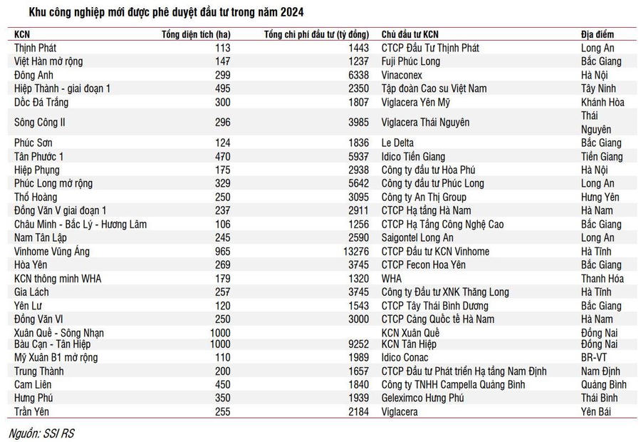 SSI cũng nhận thấy ngành BĐS KCN đang đối mặt với một số thách thức như lợi thế cạnh tranh về giá thuê trong các KCN ở Việt Nam đang dần giảm đi khi chênh lệch giá thuê trung bình ở các khu vực khác gần như rất nhỏ; và chi phí đầu tư cho các KCN mới đang tăng lên do chi phí đền bù đất để giải phóng mặt bằng tăng. Việc triển khai các biểu giá đất cập nhật tại nhiều địa điểm từ cuối năm 2024 đã dẫn đến chi phí đền bù đất cho các KCN mới tăng đáng kể. Sự tăng giá này được dự kiến sẽ làm giảm biên lợi nhuận của các dự án mới xuống còn khoảng 30-35%.