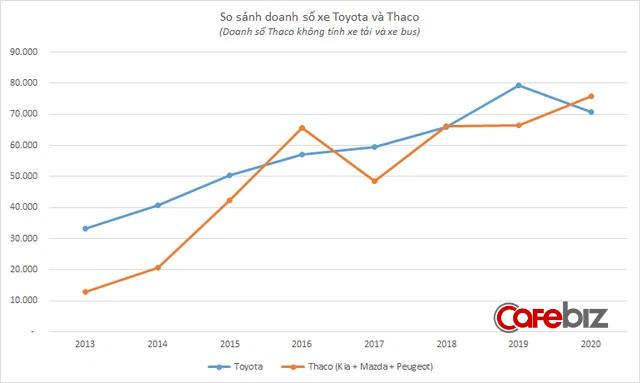 Thaco chỉ mất thêm 2 năm để đạt được mong muốn này của Chủ tịch Dương. Năm 2016, Thaco bán được tổng cộng tới gần 113.000 xe, nắm 41,5% thị phần. Trong đó, doanh số Kia và Mazda là hơn 65.000 xe, bỏ xa Toyota năm đó bán được 57.000 xe. Các năm sau đó là cuộc rượt đuổi gay cấn giữa Thaco và Toyota, khi cả hai liên tục so kè với nhau trên thị trường. Năm 2020 vừa qua, bất chấp ảnh hưởng của dịch bệnh Covid-19, 3 thương hiệu xe của Thaco một lần nữa vượt lên với gần 76.000 xe, con số lớn nhất từ trước tới nay, trong khi Toyota là gần 71.000 xe.
