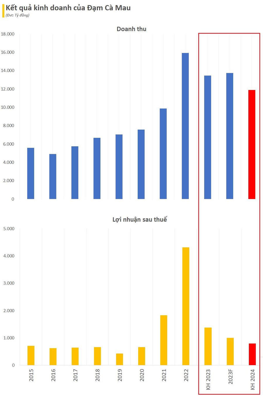 Bước sang năm 2024, Đạm Cà Mau đã thống nhất lên kế hoạch đầy thận trọng mục tiêu tổng doanh thu hợp nhất hơn 11.878 tỷ đồng, nvà lợi nhuận sau thuế gần 795 tỷ đồng. Đối với công ty mẹ, tổng doanh thu lên kế hoạch 11.081 tỷ và lợi nhuận sau thuế 794 tỷ đồng. Tỷ lệ chia cổ tức/vốn điều lệ dự kiến 10%. Các chỉ tiêu kinh doanh trong năm 2024 của DCM đều thấp hơn nhiều so với kế hoạch năm 2023, doanh thu giảm 12% trong khi lãi sau thuế giảm 42% so với kế hoạch năm 2023 đã đề ra, đồng thời là mức thấp nhất kể từ năm 2021.