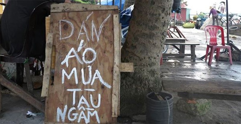 Khu lều của ông gây chú ý bởi tấm biển thô sơ lấy từ miếng gỗ phế thải: “Dán áo mưa tàu ngầm”. Ông Sỹ giải thích, đó chỉ là một cách nói ngoa cho vui và thu hút, bởi kỹ năng của ông có thể dán chuẩn đến mức áo mưa giống như tàu ngầm, không thể ngấm nước.