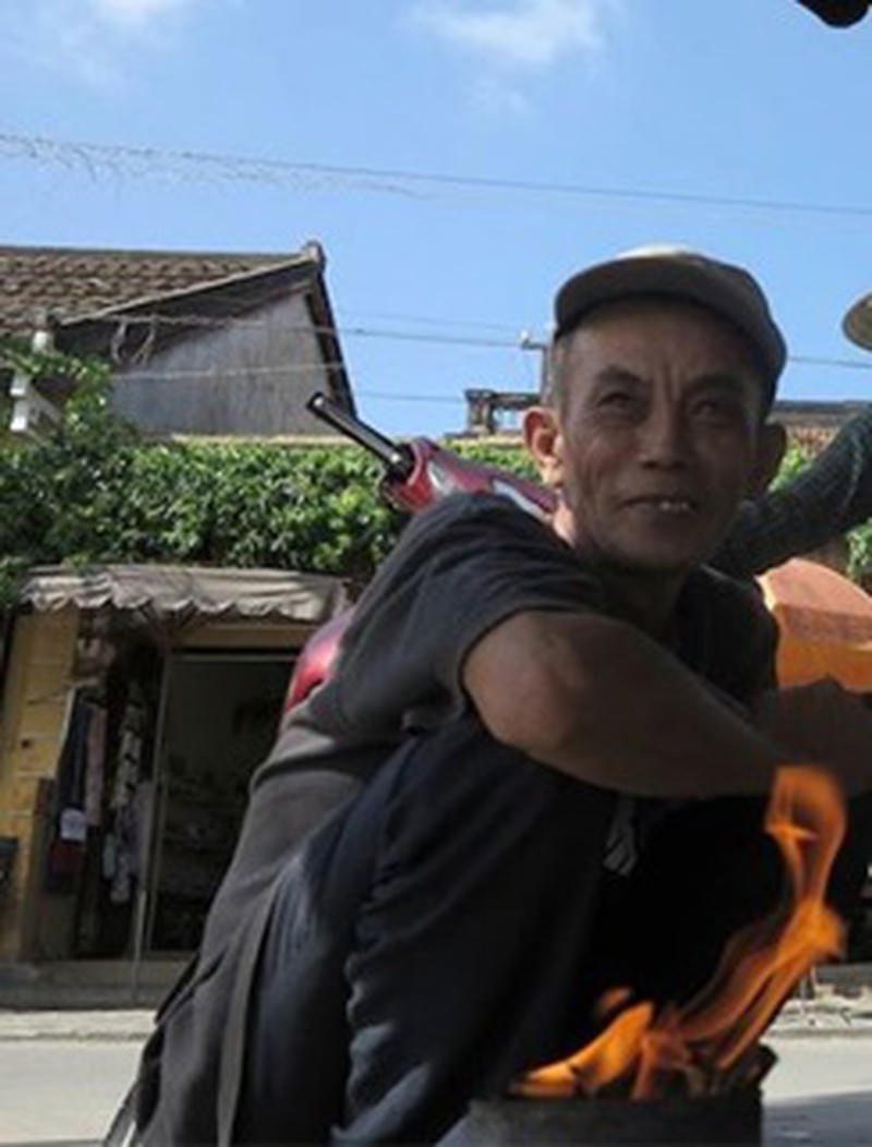 Là người có nhiều năm kinh nghiệm hơn trong nghề, bởi có lẽ vậy mà nhìn cách ông Thuận dán áo mưa cũng mang cái nghệ hơn nhiều người. Mỗi khi vá áo, ông Thuận sau khi nhóm lò than, đưa tiếp chiếc mũi hàn làm bằng thanh sắt dài, ở đầu có hình móc câu đập dẹp vào cái lò lửa mini ấy.