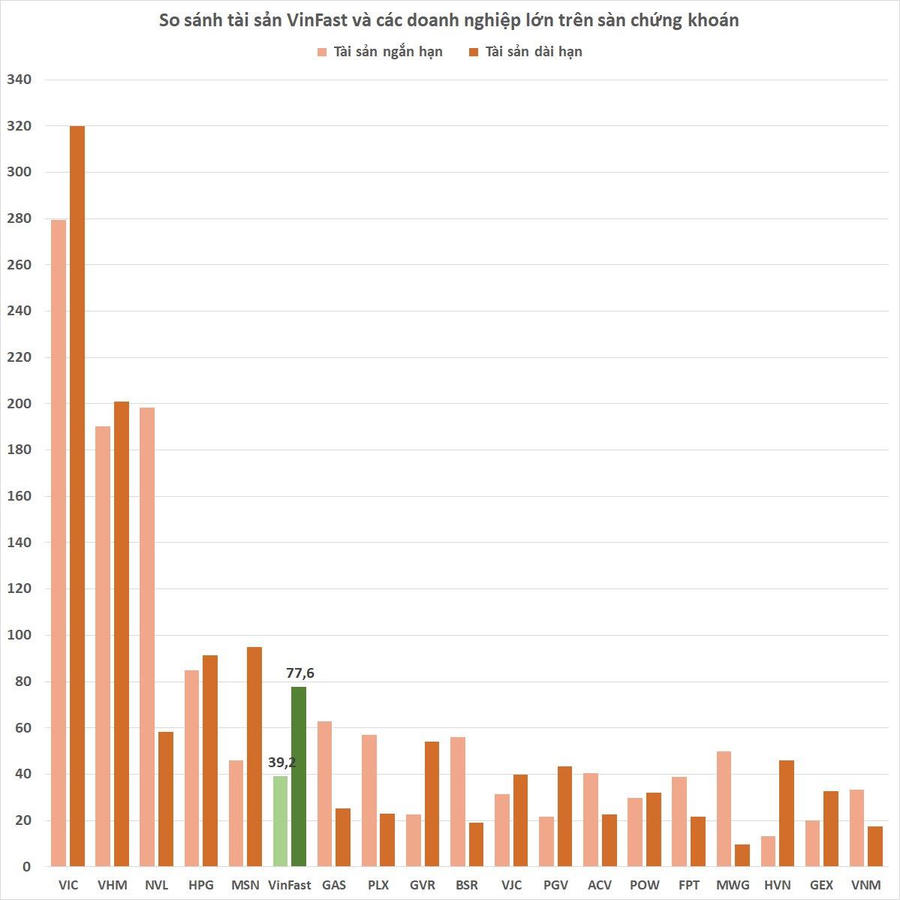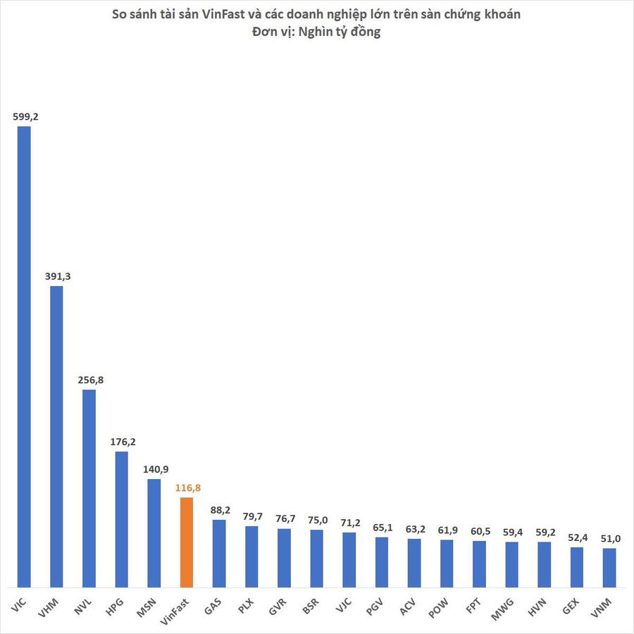 Nếu so với các doanh nghiệp trên sàn chứng khoán Việt Nam (không tính các tổ chức tài chính như ngân hàng, bảo hiểm, công ty chứng khoán), tài sản VinFast đứng thứ 6, xếp sau 5 doanh nghiệp gồm Vingroup, Vinhomes, Novaland, Hòa Phát và Masan.