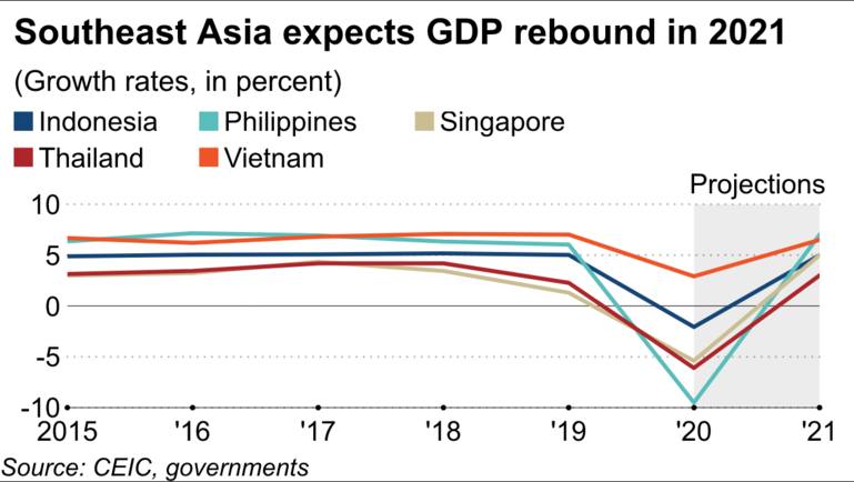 Theo Nikkei Asia, năm 2021, Việt Nam tiếp tục được dự báo sẽ dẫn đầu tăng trưởng kinh tế ở Đông Nam Á với mức tăng GDP đạt 6,5%. Đứng sau đó là Singapore với 6%, Indonesia khoảng 5,5%, Thái Lan khoảng 3,5%...