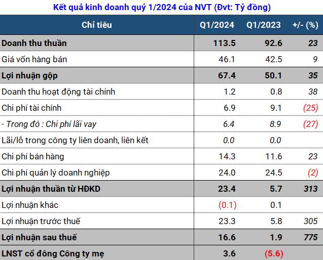 Trong quý I/2024, Ninh Vân Bay ghi nhận lãi ròng 3,6 tỷ đồng trong khi cùng kỳ lỗ 5,6 tỷ đồng.