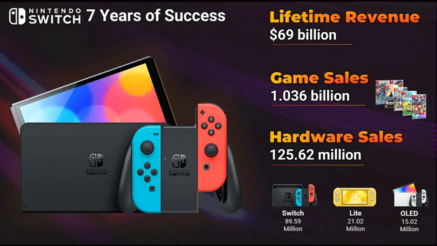 Doanh số cụ thể của từng dòng máy đó là 89,59 triệu chiếc Switch, 21,02 triệu chiếc Switch Lite và 15,02 triệu chiếc Switch OLED. Trong 7 năm qua, Nintendo đã đạt tổng doanh thu ròng ước tính khoảng 74 tỷ USD. Như vậy có thể thấy hầu hết doanh thu này đến từ phần cứng Nintendo Switch.