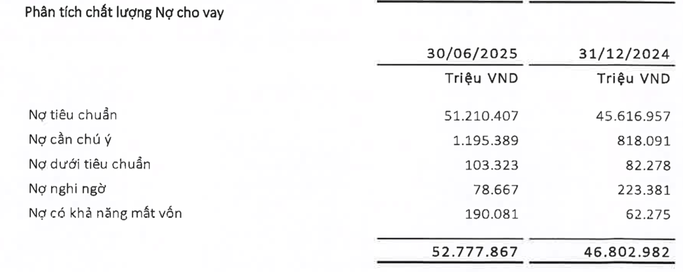 Nợ ngắn hạn tăng mạnh từ 21.000 tỷ đồng lên gần 23.400 tỷ đồng, nợ trung hạn từ 18.700 tỷ đồng lên hơn 21.400 tỷ đồng. Tỷ lệ nợ xấu vẫn ở mức 0,7%, nhưng điều đáng báo động là nợ có khả năng mất vốn đã tăng gấp ba lần, lên hơn 190 tỷ đồng chỉ trong 6 tháng, cho thấy phần lớn nợ nghi ngờ đã rơi xuống nhóm nợ xấu nhất.