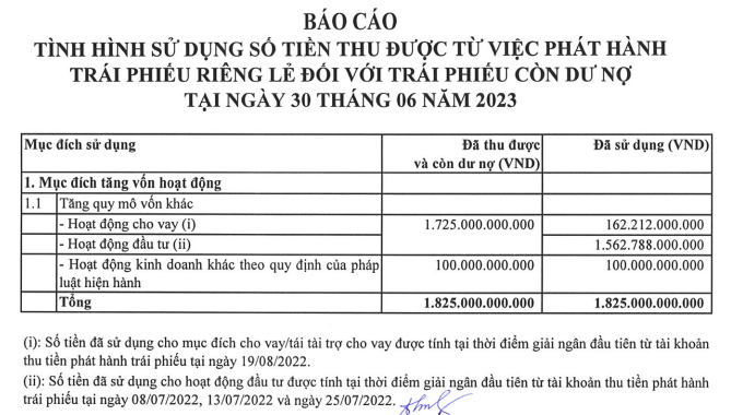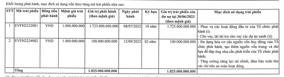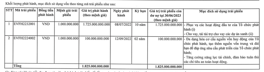 Bên cạnh báo cáo về tình hình tài chính, EVN Finance cũng ra báo cáo về tình hình sử dụng số tiền thu được từ việc phát hành trái phiếu riêng lẻ đối với trái phiếu còn dư nợ tại ngày 30/6/2023. Báo cáo cho biết, công ty đã thu được 1.825 tỷ đồng từ phát hành trái phiếu, và sử dụng 1.825 tỷ đồng, trong đó EVF dùng 162,2 tỷ đồng cho hoạt động cho vay và 1.562,7 tỷ đồng dành cho hoạt động đầu tư.