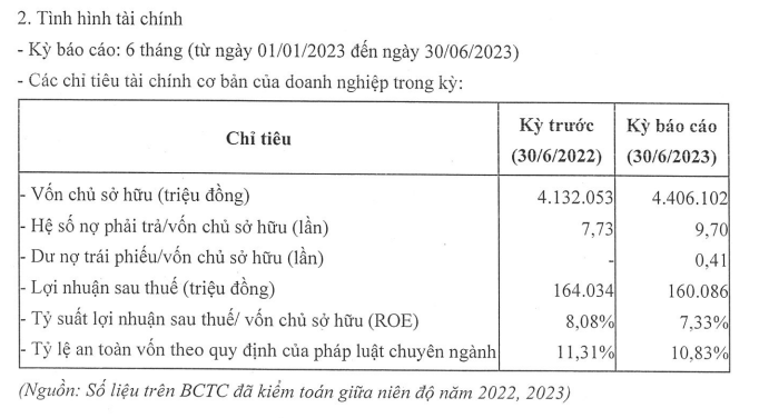 Hệ số nợ phải trả/vốn chủ sở hữu tính tới ngày 30/6/2023 là 9,7 lần, tương đương nợ phải trả vào khoảng 42.739,2 tỷ đồng. Trong khi đó, ở cùng kỳ năm ngoái, hệ số nợ phải trả/vốn chủ sở hữu là 7,73 lần.