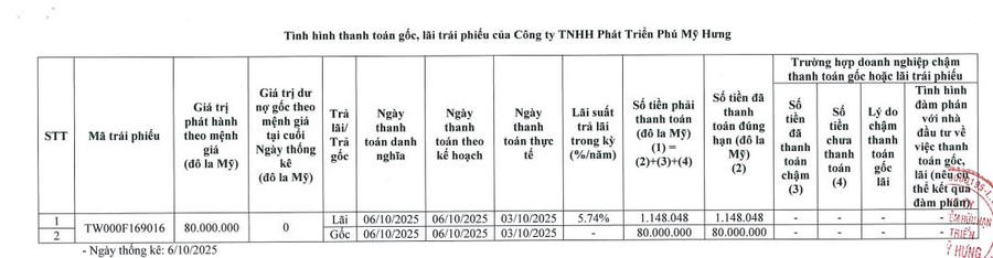 Ngày 6/10, Phú Mỹ Hưng đã thanh toán 80 tỷ đồng tiền gốc và hơn 1,1 tỷ đồng tiền lãi trái phiếu TW000F169016, qua đó tất toán xong lô này.