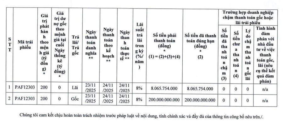 Theo đó, ngày 24/11/2025, Pan Farm đã hoàn thành việc thanh toán 200 tỷ đồng tiền gốc và gần 8,1 tỷ đồng tiền lãi tại ngày đáo hạn cho lô trái phiếu mã PAF12303 (PAFCH2325003).